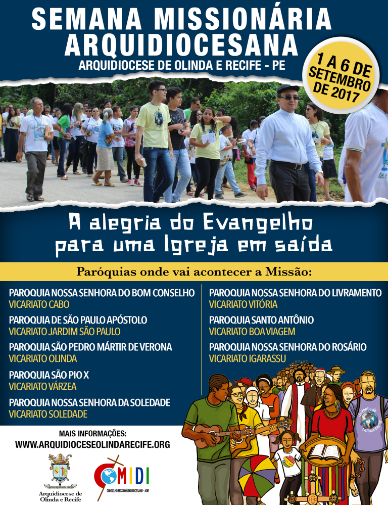 Para acender no coração de toda a arquidiocese o ardor missionário de lançar redes em águas mais profundas e anunciar a Boa Nova,  a Arquidiocese de Olinda e Recife promove de 01 a 06 de setembro, nos oito vicariatos, a Semana Missionária. Adotando o tema “A alegria do Evangelho para uma Igreja em saída” e o lema “Meu espírito exulta em Deus, meu salvador” (Lc 1, 47), o evento é organizado pelo Conselho Missionário Diocesano (Comidi) e consiste em fase preparatória ao 4º Congresso Missionário Nacional (Comina), que acontecerá no Recife, de 7 a 10 de setembro, no colégio Damas.