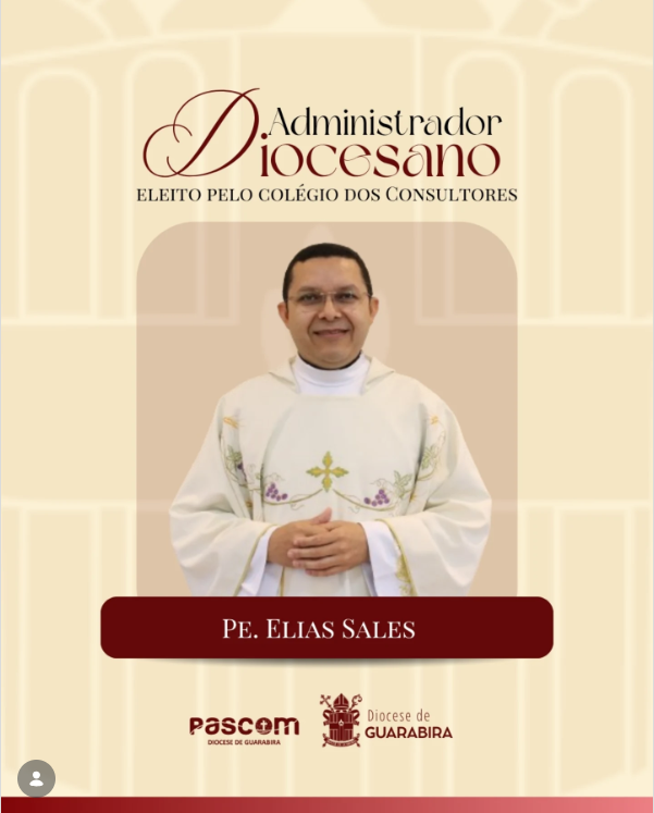 A Diocese de Guarabira (PB) anunciou, nesta sexta-feira (10), a eleição do padre Elias Sales como novo administrador diocesano. O sacerdote escolhido pelo Colégio de Consultores assume o governo da igreja do agreste paraibano após a transferência de dom Aldemiro Sena para a Diocese de Teixeira de Freitas-Caravelas (BA).