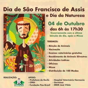 A Paróquia de Casa Forte programou um dia intenso com bênção de animais, celebração eucarística, ações de educação ambiental, atendimento de serviços veterinários, distribuição de mudas de árvores e de arranjos florais, além de atividades lúdicas para crianças da Casa da Criança Marcelo Asfora (ver programação). “É um dia muito importante, no qual celebramos a vida de um santo que doou sua vida pelos pobres e teve o olhar amoroso para toda a criação de Deus. São Francisco entendeu o valor da criação, enalteceu a natureza, ao ponto de tratar os animais como seus irmãos”, afirmou o padre Deyvson Soares, que está à frente da programação da paróquia de Casa Forte. O padre pede que, se possível, as pessoas levem sua doação de ração que será usada para alimentar animais abandonados nas ruas do Recife.